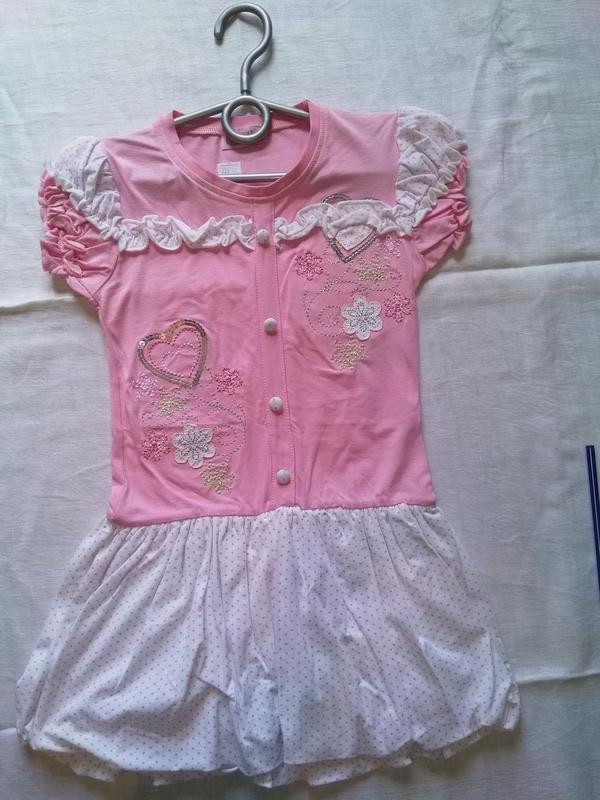 Нове плаття з якісного бавовняного трикотажу. Виробництво Туреччина . Ширина під проймами 29 см. довжина 57 див. Красива вишивка з паєтками. Талія занижена. Спідниця-балон. Буде добре на худенькій дівчинці.