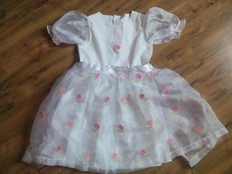 Ошатне біле платтячко. Спідничка і рукавчик органза з вишитими квіточками. Спідничка знімається. Ззаду бант з атласної білої стрічки. Довжина 57см, плечі 22см, ПОГ 28см.