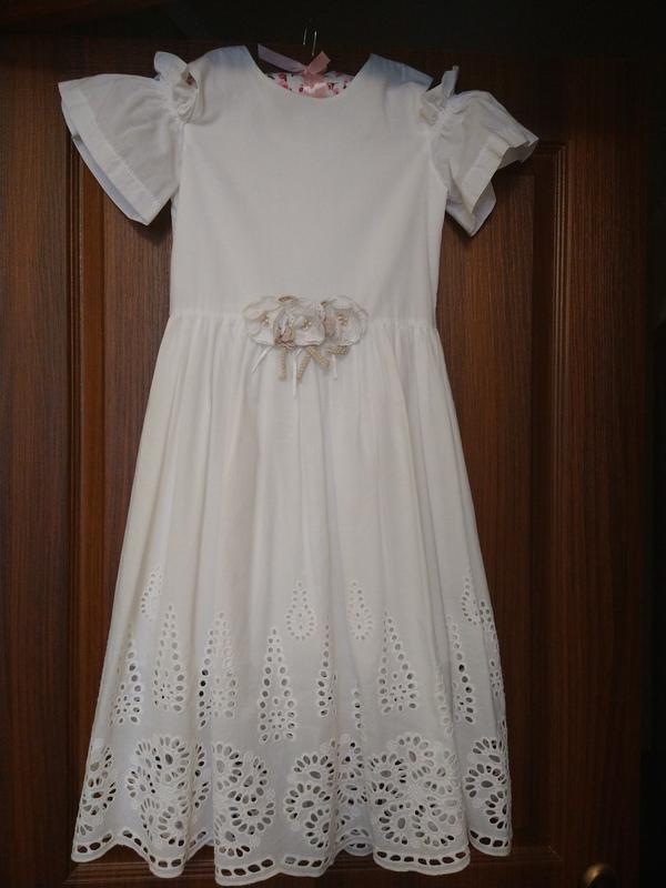 Святкова, ніжна сукня з рішельє.Оригінальніі плічка, які можна регулювати. ПОГ 35, ПІТ 34, довжина 90. Одягали на перше причастя.