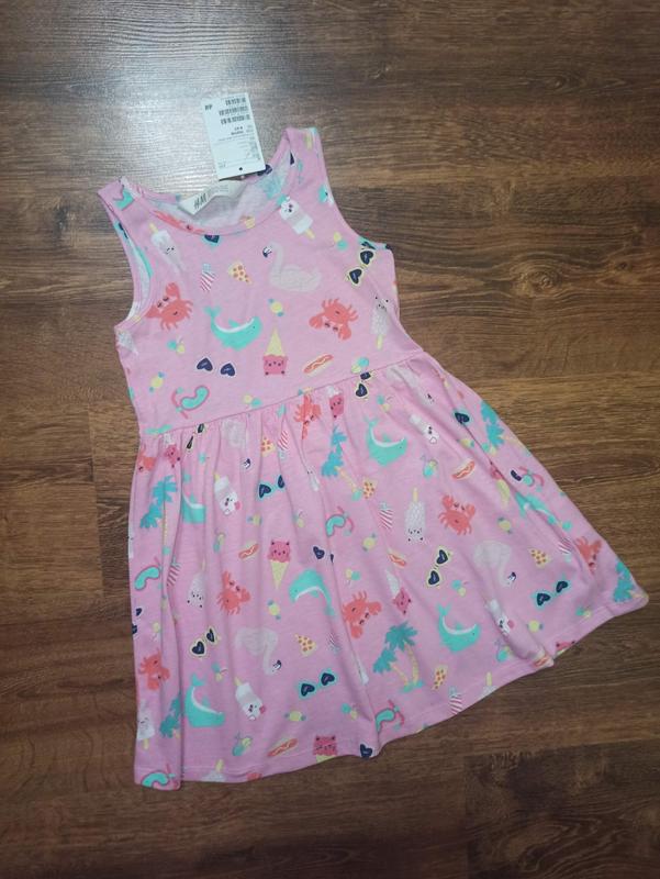 Красивое и милое платьице для девочки 5-6 лет(110-116) от фирмы H& Платье новое,с биркой.Цвет розовый с весёлым принтом, смотрите фото.Состав 100% хлопок. Замеры: длина-61см ширина-30 см