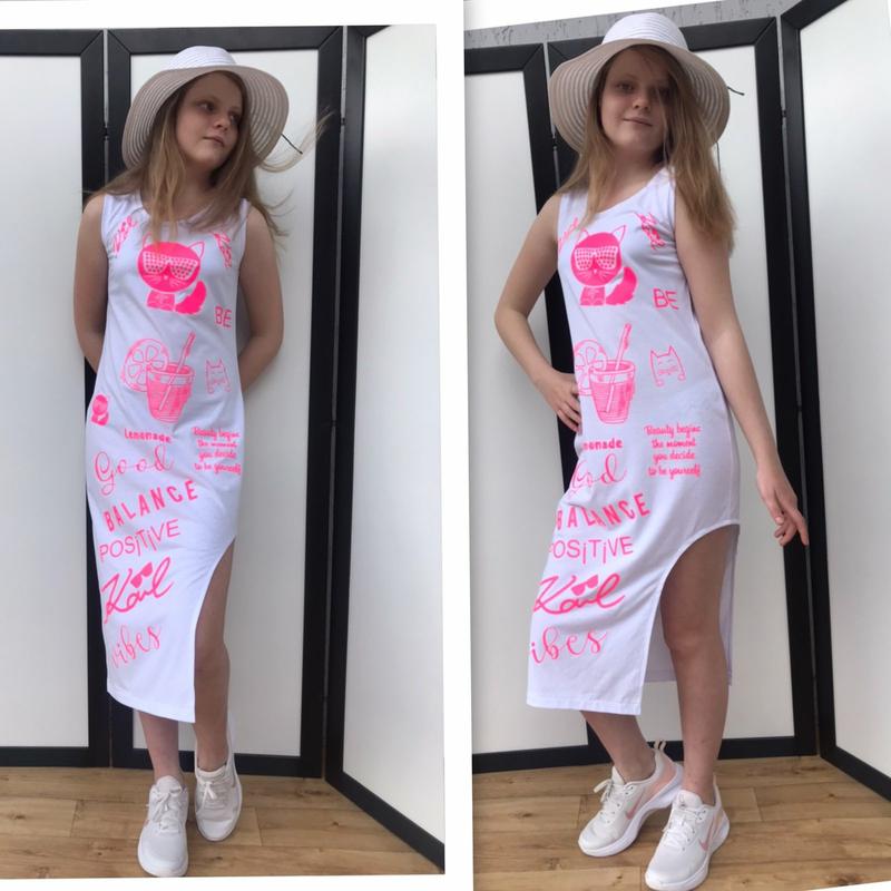 NEW літо 2021 ☀️ ☀️Сукня «Позитив» Турецький трикотаж/кулір спів - бавовна Вільного крою, видовжене, збоку з вирізом. ☀️Бавовна - на жарке літо і море Якісний термотрансфер (термонакат). Розміри повномірні. ☀️Колір: білий РЕКОМЕНДУЮ!!! розмір/☀️довжина/пог/побіди 152/☀️102/39/43-1шт 164/☀️109/42/48-1шт