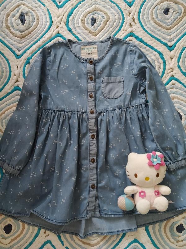 Плаття з легкого джинса з дрібним принтом. Застібка на гудзиках спереду, так само є один кишенька. Рукав на манжетике. Передня поличка укорочена. Реальний колір на першій і другій фотці. Заміри: ДІ-48/53 ІН-35 Піт-30