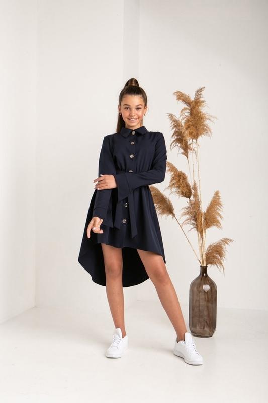 Круте плаття для модниць колір темно-синій, тканина костюмка, кнопки по всій довжині,на талії під гумку, поясок в комплекті, полномеры. довжина по переду/пог/рукав 140-73/39/52 146-74/41/53 152-77/43/57 158-79/43/58 164-80/44/61 140-2шт 146-2шт 152-2шт 158-продано 164-1шт.немирівська