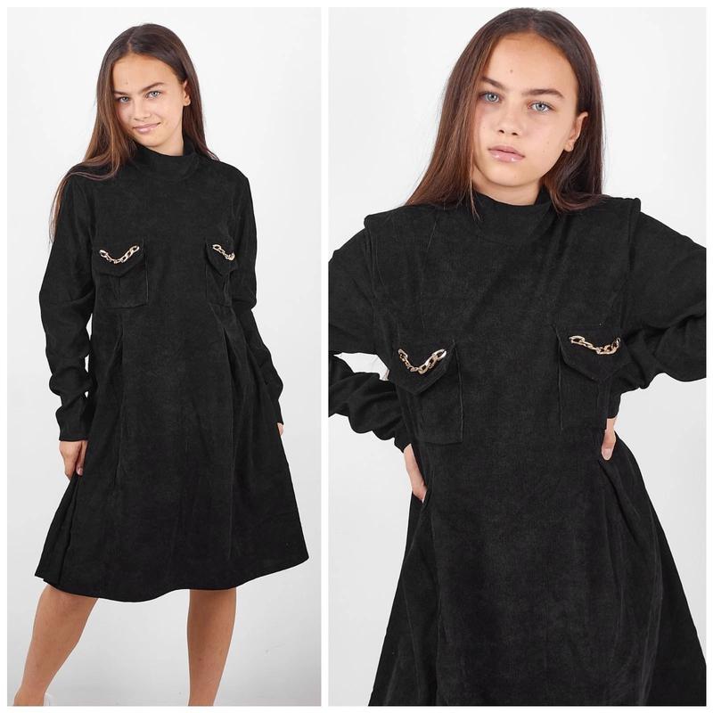 Новинка😃🔥🔥🔥 ⭐Очень красивое вельветовое платье. Свободного кроя, с красивыми складами, украшено трендовыми цепочками. ⭐Ткань: микровельвет ⭐Цвет: черный ⭐Дополнительно: на спинке потайная змейка р.140- длина 74 см/ ПОГ 34 см/ рукав от плеча 50 см-1шт р.152- длина 80 см/ ПОГ 38 см/ рукав от плеча 54 см-1шт