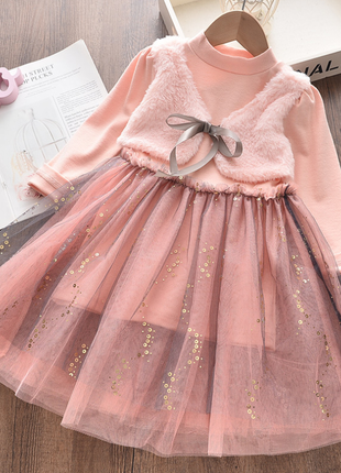💝В наявності 💝 🎀Красиве, ошатне плаття 🎀Верх: трикотаж + пришита хутряна жилетка 🎀Низ: фатин 3 шари , оздоблений паєтками 🎀Розміри пишу по бірці Орієнтуйтеся на заміри Допустима похибка +- 1-3 см 📦Товар, перевіряємо на пошті 🚗Відправка 1-2 дні 🍀Розміри: 🦋140р - дл. 65,5 см, шир. 33,5 см, рукав ( від шиї) 49 см