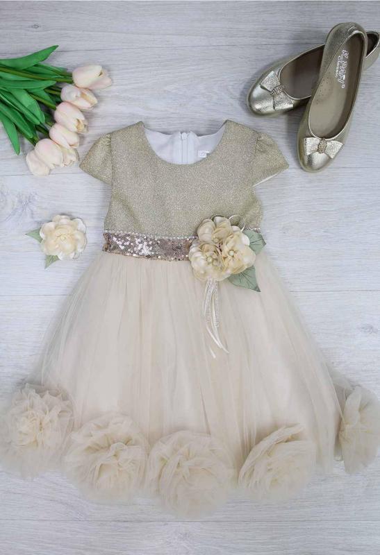 Розмір вказано 116,але буде і раніше. Заміри: Довжина 60 см ПОГ - 28-29 см ПОТ-28 см плечі 23,5 см Дуже гарне плаття для дівчинки. Верх виготовлений з люрексовою тканини. Спідниця - багатошарова з натуральною підкладкою , атласною другий спідницею і третьої красивою шифоновою. Застібається ззаду на блискавку. Прикрашає дану модель пояс з паєтками і брошкою, що зав'язується ззаду на великій фатиновый бант. В додаток до сукні йде затискач волосся з квіткою в тон до плаття. У такому вбранні Ваша дівчинка буде виглядати як справжня принцеса. Склад: бавовна - 80 %, поліестр - 20 %