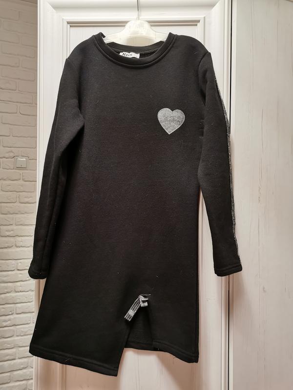 Трикотажна сукня прямого крою з сріблястими вставками на рукавах та з розрізом на лівому коліні. Зверху на розрізі сріблястий бантик. Півобзват грудей 35/36 см Довжина рукава 45/48 см Довжина виробу 62/64 см