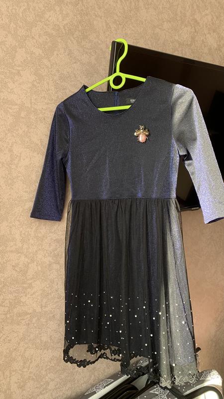 Сукня не разу не одягнули, бирці немає. Розмір вказано 34 (140 СМ). Красивий синій колір хамелеон, переливається, зверху фатин/сітка чорного кольору з намистинками, рукав три чверті. Загальна довжина 82 см, рукав-36 см, талія 33 см, підлозі обхват грудей 36 див. Виробник Туреччина.