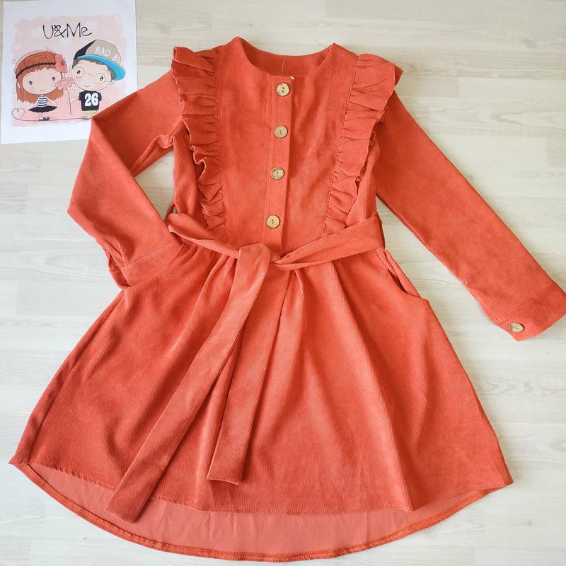 Вільветове пляття для дівчинки Рюшів на грудях, додає платтю святковості пояс знімається, є кармані на грудях гудзики функціональні, розстібається до пояса. позаду плаття подовжене колір морквяний розмір/довжина перед(спинка)/пог/рукав від вирізу 140р/72(77)/42/58 146р/74(81)/42/61 152р/77(84)/43/63 Похибка +-2см