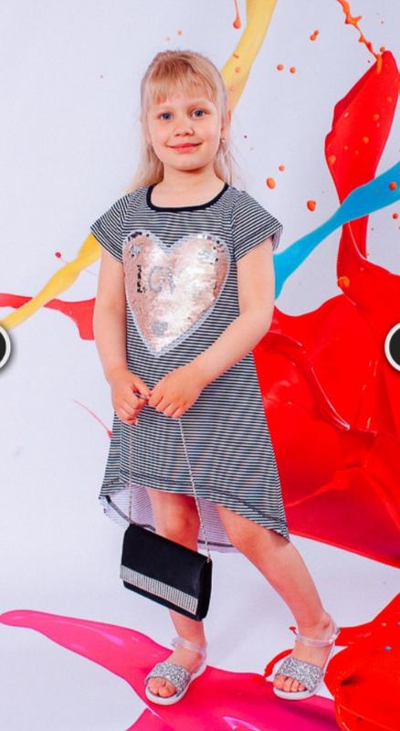 Сучасне плаття для дівчаток, які хочуть бути оригінальними. Передня частина сукні коротший, ніж задня. Модна аплікація з пайеток обов'язково сподобається вашому малюку