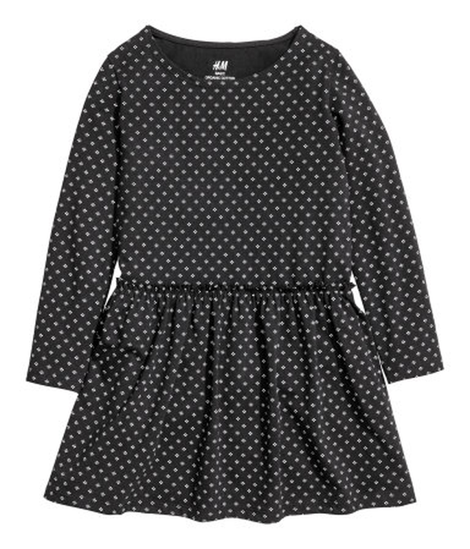 Стильне трикотажне плаття на дівчаток від H&M. Дитяче плаття з тонкого еластичного трикотажу прекрасного європейського якості, органічний бавовник. Базове сукню чорного кольору з лаконічним геометричним принтом. Стильна класична модель чорного плаття буде доречна для школи і повсякденного носіння. Склад: 95% органічний бавовна, 5% еластан. Розмір 122 - 128 на 6 - 8 років. Довжина 65, плечі 27, рукав-47,від плеча до спідниці 38, від спідниці 28, ширина 34.