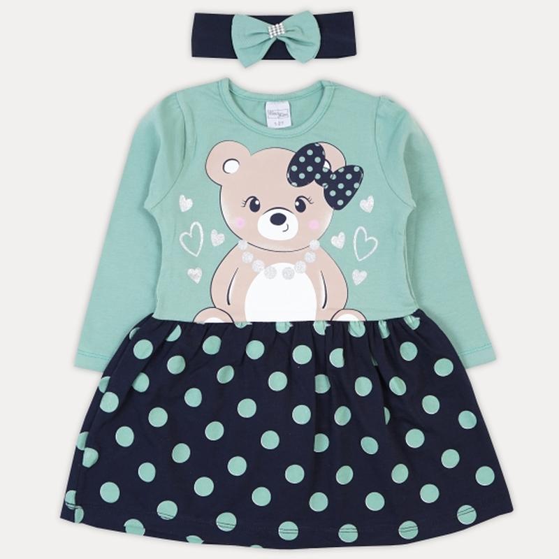 Сукня з довгим рукавом, спідничкою в горошок і аплікацією спереду у вигляді милого ведмедика з бантиком. На пов'язці теж милий бантик. Платтячко виконане в різних кольорах на Ваш вибір! Полотно вироби – фуликра. Розміри: Ріст 86см(1-2 роки):Довжина-47см,Ширина по грудях-24см,Рукав-30см Зростання 92см (2-3 роки):Довжина-50см,Ширина по грудях-25см,Рукав-32см Ріст 98см(3-4 роки):Довжина-53см,Ширина по грудях-26 см,Рукав-33см Ріст 104см (4-5 років):Довжина-55см,Ширина по грудях-27см,Рукав-35см