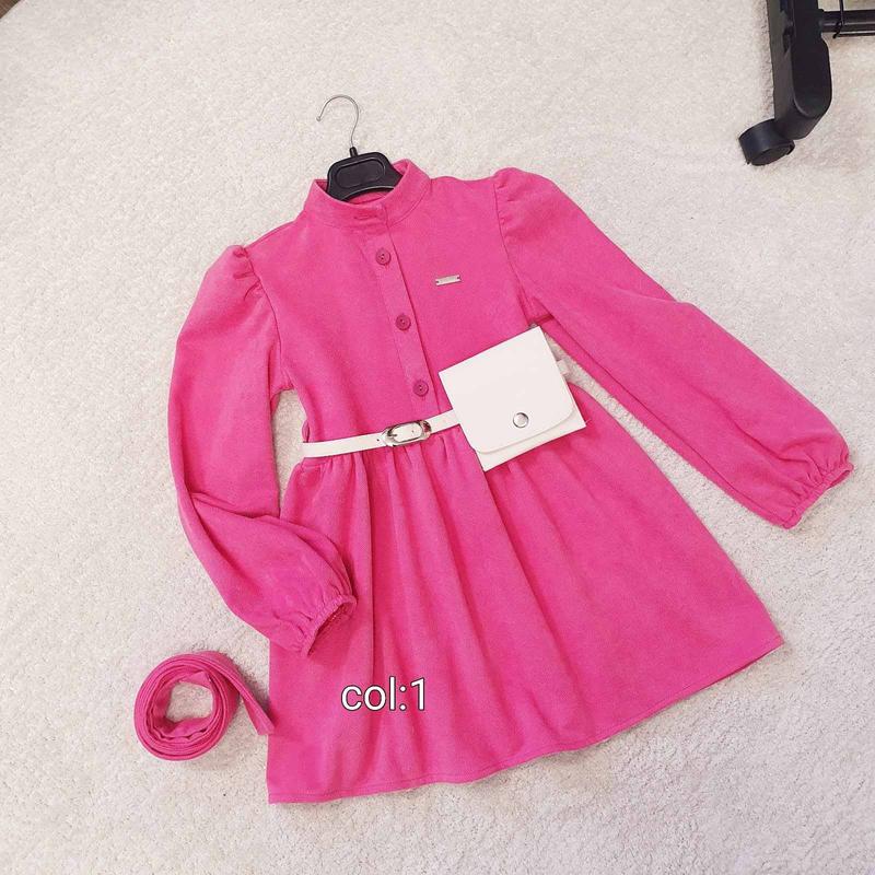 Красивое платье , рукав фонариком ,ткань вельвет , застегивается на пуговки , воротник стоечка , в поясе и на рукавах есть резиночки , поясок входит в комплект длина/рукав/пог 110-58/45/32 116-61/47/33 122-64/50/34 128-68/53/35 артmasya