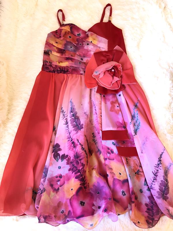 Святкова сукня червоного кольору в квітковий принт з шифону і атласної підкладки з шаликом