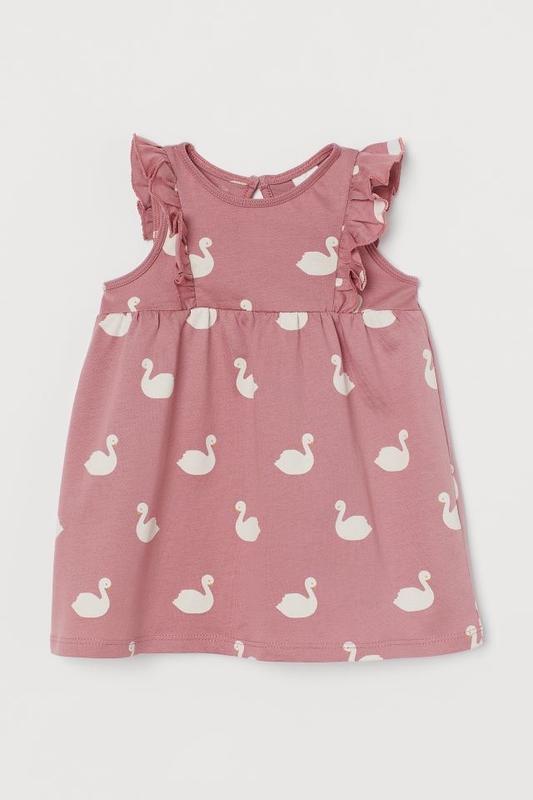 Чудова літня сукня з оборками H&M Відмінна якість за чудовою ціною! Сукня без рукавів з м´якого бавовняного трикотажу. Воланами спереду, що переходять від плечей до спини, невеликий отвір на задній частині горловини з гудзиком і збірний шов над розкльошеною спідницею. Колір: античний рожевий/лебеді. Розміри у наявності: 92, 104. Ціна кінцева.