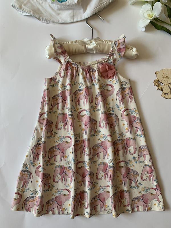 Милий сарафан з рожевими слониками на молочному тлі, крильця бретельки і пудроворозовый квітка надають ніжності, фірма Tu 2 роки, р 92 див. Ширина пахвами 30 см, довжина від пахви 38. Сарафанчик в ідеальному стані