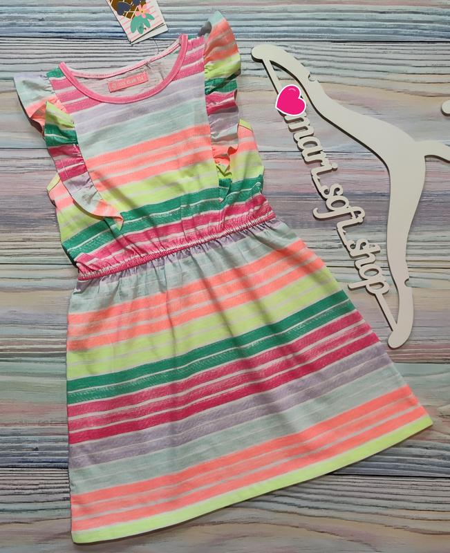 Яркое полосатое платье от Cool Club в размере 104 см (с6). Тонкие и яркие оборки на плечах, резиночка на поясе. 100% хлопок. Замеры: длина 60, пог 29, пояс 25,5. При покупке трех товаров – укрпочта в подарок!