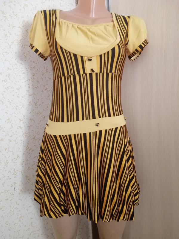 Плаття-туніка в гірчично-чорному кольорі.Спідничка подвійна , знизу на резинці ( бананка) Гарно тягнеться.Довжина 73 см, ПОГ 37 тягнеться до 45 см, стегна п/о 50 до 55 див.