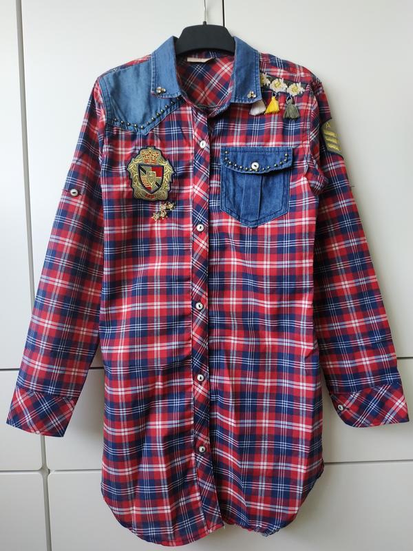 платтячко-сорочка з нашивками. рукав можна завернути і застібнути на ґудзик. вдягали декілька разів, стан новий. звертайтесь за питаннями в особисті повідомлення)