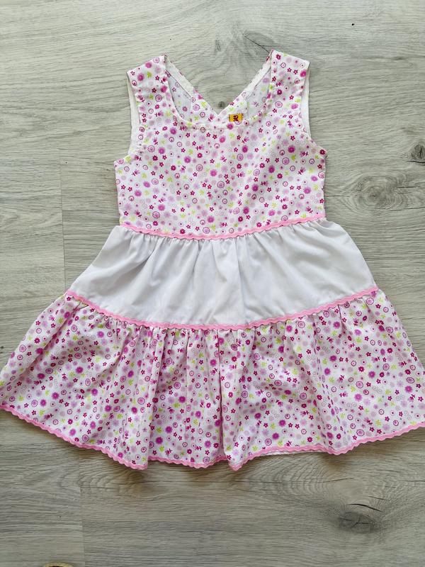 Легенька літня сукня, на спинці пугвички. Стан нової, без нюансів. На ріст 98-110 см Довжина 52,5 см Пог 28 см Пот 26 см Дивіться інші мої оголошення. При покупці від 3 промов буде знижка)