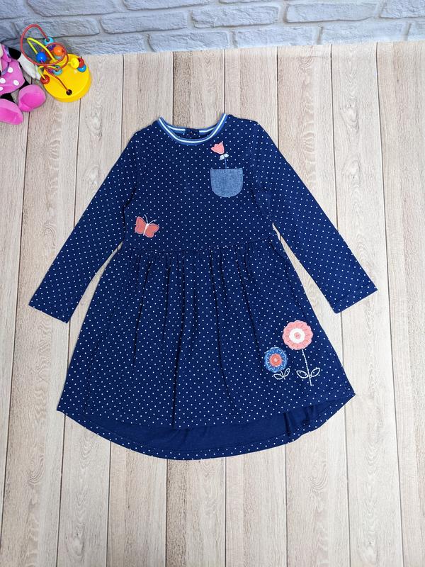 Трикотажна сукня на 3-4 роки по бірці, але великомірить. Довжина 54/60 (ззаду), рукав 36.