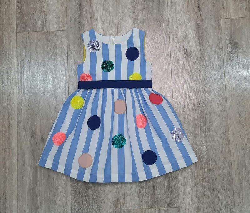Летнее, яркое платье на 3-4 года. Ткань хлопок, подьюбник тоже хлопок. Украшено узорами из разноцветных паеток. Длинна 56 см, ширина под руками 29 см.
