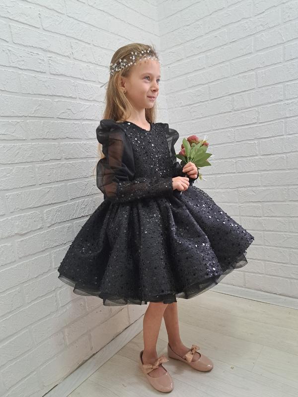 Нарядна чорна сукня від року до семи років. До тіла хлопок. Модна підібрати обруч чи повязочку. Дуже пишна та блискуча. Вся розшита паєтками та бусинами різного діаметру.