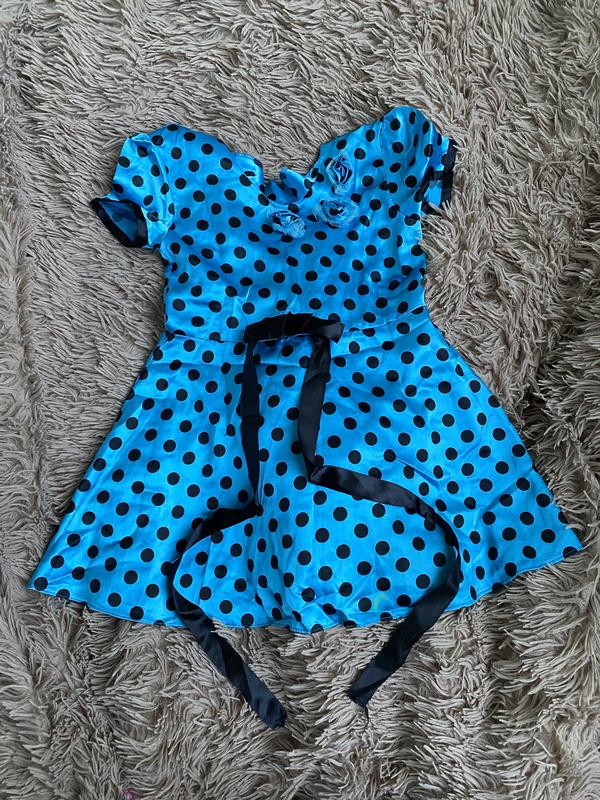 Синя блакитна сукня плаття для дівчинки в чорних горох горошок з поясом квіточками літнє а...