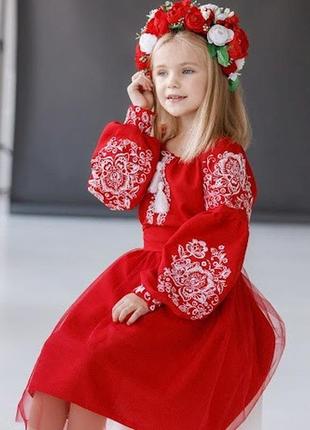 Вишивана сукня для дівчинки. Виконана на добротній тканині габардин якісною машинною вишивкою, густою, акуратною Сукня вишиванка оздоблена фатином (турецькою сіткою), яка відмінно тримає форму та додає суні пишності, робить її дуже нарядною Сукня виглядає дуже ошатно Розміри: 104, 110, 116, 122 - 950 грн, 128, 134, 140, 146 - 1000 грн 152, 158 - 1100 грн До суконь маємо віночки та коралі у продажу!
