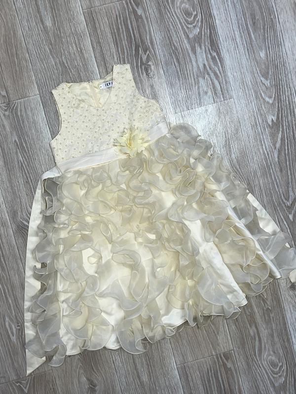 Шикарное платье с воланами, вышитым узором и жемчужинами. Застежка змейка, сзади завязывается на бант. Очень пышное и торжественное😃 8 лет Длина 73(24). ПОГ 32’5