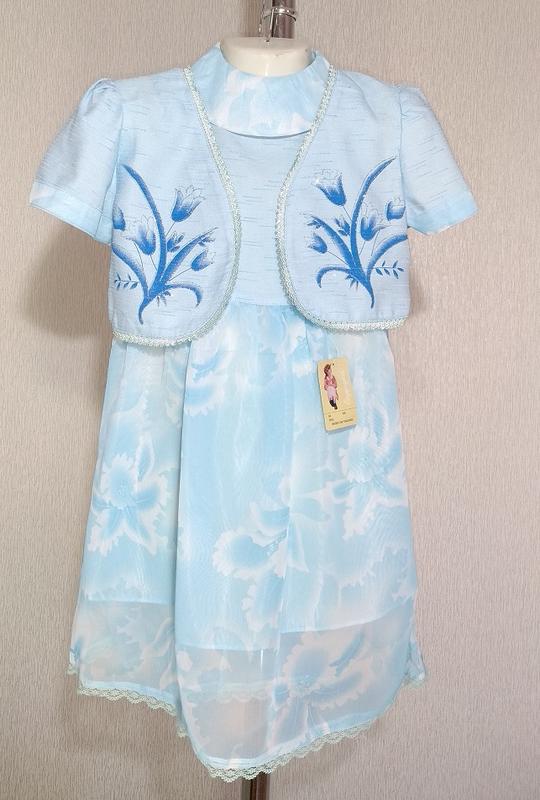 Нарядный комплект на девочку. Верх платья и болеро -лен. Низ платья -шифон Платье на х/б подкладке. На болеро вышивка цветов. Застежка молния .Есть пояс на талии размер6-- длина 65см.ПОГ-28см.ПОТ-27см размер8-- длина 67см.ПОГ-30см.ПОТ-29см размер10-- длина 69см.ПОГ-32см.ПОТ-31см Как происходит покупка: -Предоплата на карту Приватбанка (с наложкой не работаем!) -Возврата и обмена нет.Цены оптовые отправка сразу после оплаты ! ОТПРАВКА УКРПОЧТОЙ 1 -2 РАЗ В НЕДЕЛЮ НОВОЙ ПОЧТОЙ 1-2 дня