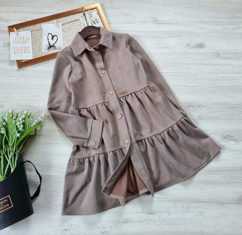 Стильное платье свободного кроя ткань замш диагональ затегивается на пуговицы 128(1 шт)-длина 63,пог 33,рукав 46 134(1 шт)-длина 69,пог 34,рукав 48 140(1 шт)-длина 73, пог 35,рукав 50 146(1 шт)-длина 77,пог 38,рукав 53 152(1 шт)-длина 81,пог 40,рукав 54 +-2 см