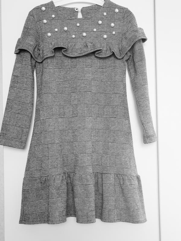 Сукня сіра в клітинку з перлинками на зріст 116-122. Довжина 61 см, рукав 37 см. Стан нового без дефектів.