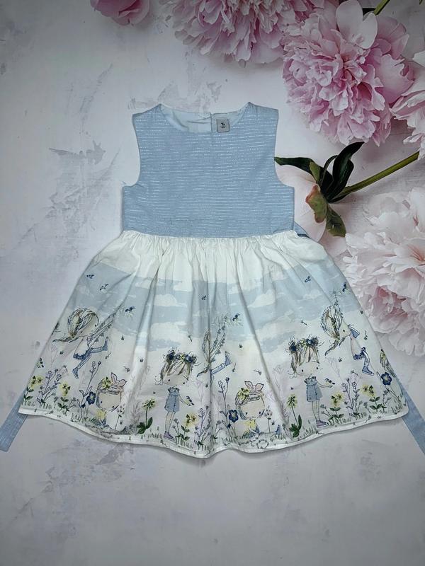 Плаття Верх блискучий, прошитий люрексом, на котоновій підкладці. Спідниця котонова, на підкладці поліестер із фатином. Ззаду зав'язується на бант. Застібка ззаду на ґудзики Стан ідеальний без дефектів 🏷Tu 4-5 років Довжина 60(24). ПОГ 30