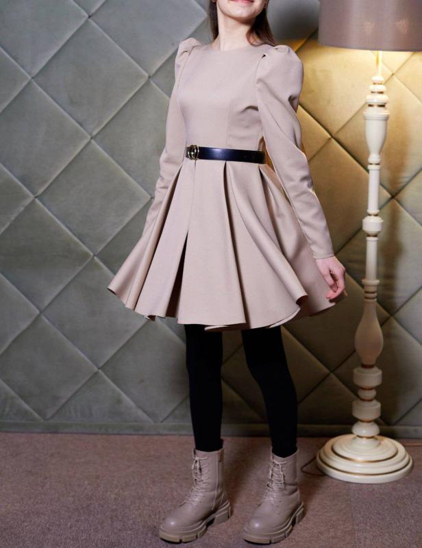 Нарядна сукня на струнку дівчинку. Шилася під замовлення. Є підкладка. Колір беж. Довжина 74 см, ОТ- 31 см, рукав-59 см. Без ремінця.