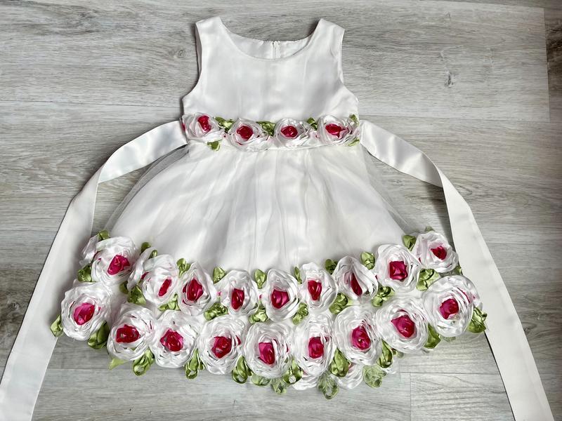 Платье ,сукня на девочку нарядное,праздничное,пышное 12-18мес (годик). Очень красивое и нежное. Отличный вариант для празднования первого годика, для фотосессий или любого торжества. В холодное время года под них можно одеть кофточку или гольфик. Достаточно пышное,хорошо держит форму. Юбка трехслойная. Состояние идеальное,одето один раз. Замеры: длина 51, пог 26, Пот 25.