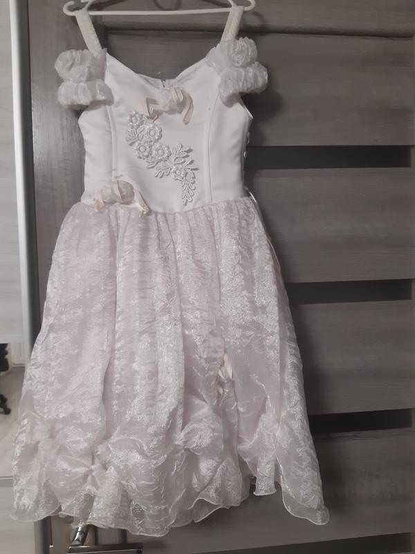 Дитяче плаття нарядне. Розмір на 3-5 років. На третьому фото дефект немає однієї трояндочки. Заміри пояс по корсеті 29 см, груди 28 см, довжина з бретельками 79 см