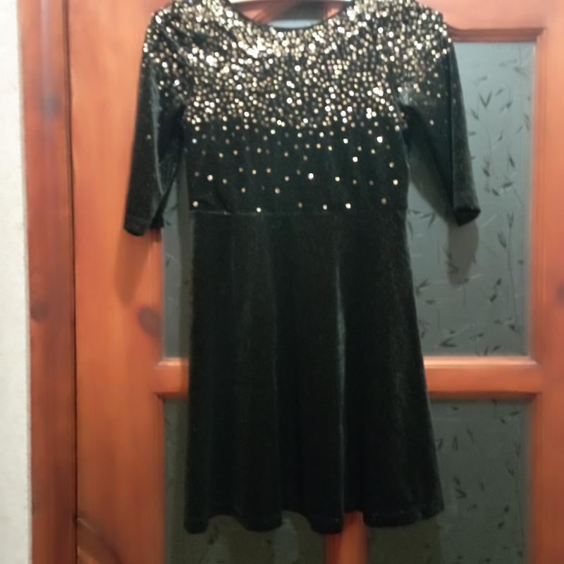пог 36 талія 33 довжина 78 рукав 33 застібається на блискавку. Підкладка на кокетці є, верх сукні з підкладкою. стан ідеальний, паєтки пришиті, сама тканина велюр з блиском. Чудова святкова сукня