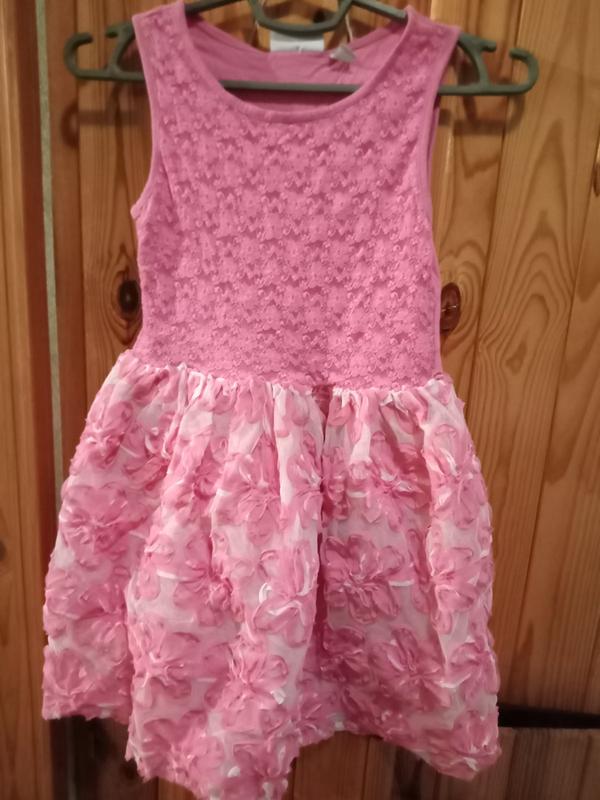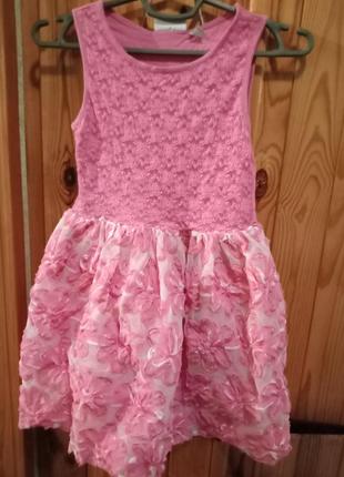 Літнє плаття для дівчинки. Після однієї дитини. Бред - Children's Place ( Чилдрен Плейс . Розмір 7-8,колір рожевий, без рукавів. Низ - фатин. Перед фактурний, ззаді - трикотаж - котон (є розводи, наче від прання, не кидаються в очі, на фото видно). В комплекті пояс з квіткою.