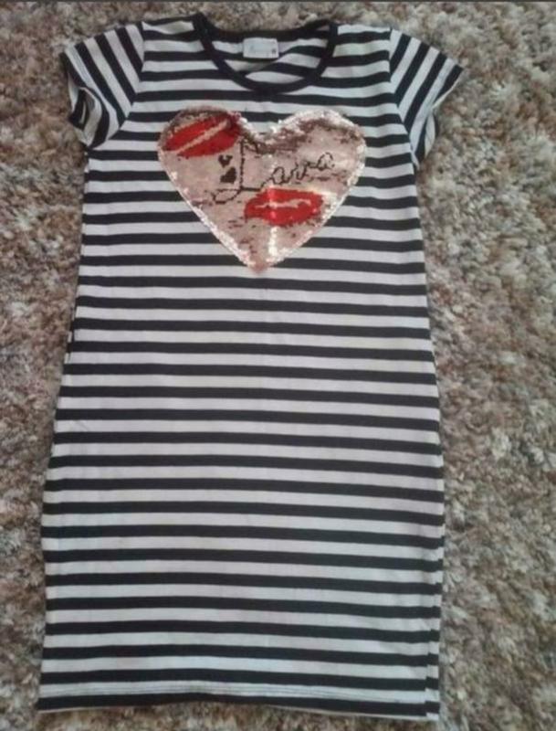 Стильне платтячко в паєтки-перевертиші ф. BARMY ( Болгарія) на р. 140, 95%котон,5% еластан, стан ідеальний(як нове).Якісний трикотаж, збоку кишеньки, паєтки міняють 2 відтінки Довжина 74см,під ручками 39див, плечі 6,5 см, рукавчик 9см