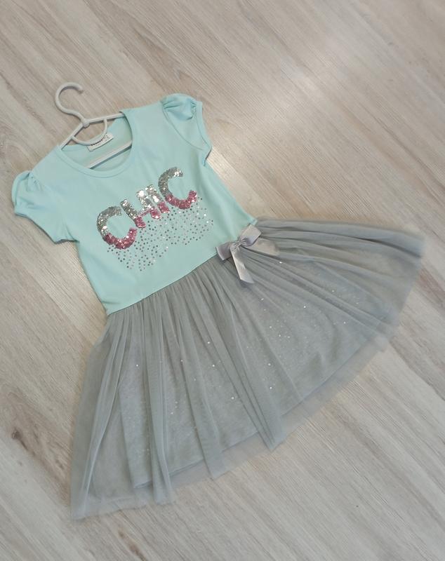 Красива сукня вдягнена лише один раз. Спідничка мерехтить. Верх як футболочка тягнеться. Дуже приємна на дотик. Фатін м'який і ніжний. Висіла в шафі десь взялись невилички плямки(див 4 фото). Виводити не намагалася. Але загалом вони майже не помітні. Ловила їх при різному світлі, щоб сфотографувати.
