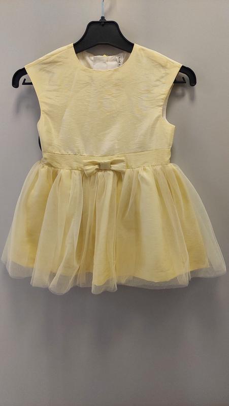 Платье из гладкого материала, приталенного талии - втачной пояс в тон изделию. Отрезная от линии талии двухслойная юбка в волнистую силуэта. Без рукава. Круглый вырез горловины. На складку. На спинке - потайная застежка на молнию. Спереди декоративный бант. Платье на 3 года