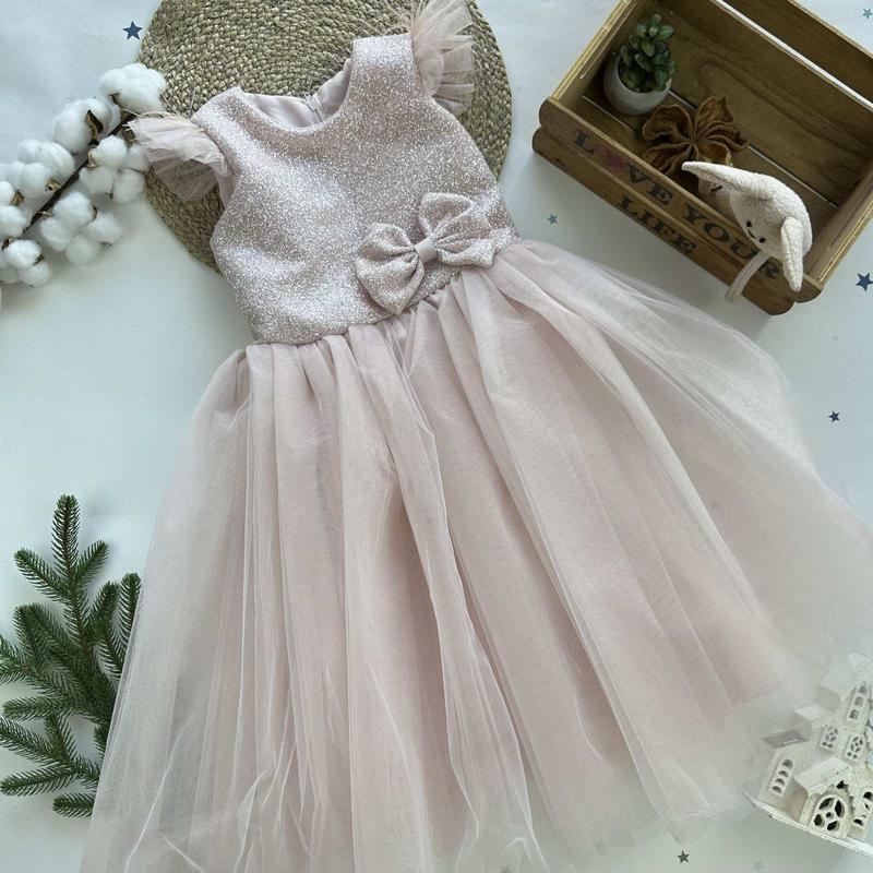 Сукня . Верх- прикращений глітером. Низ- декількашаровий фатин, підклад- атлас. Сзаду- на потаємній блискавці, додатково- шнурівка. В плечі волан та додаткова прикрашено декоративним пір’ям. Розмір: візуально 6-8 років. Довжина 79 см, півобхват 30 см.