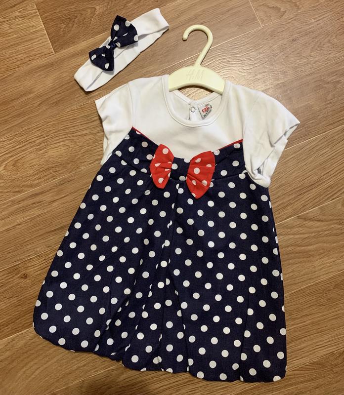 Мила сукня в горошок для маленької принцеси Є підкладка Ідеальна на літо Розмір вказаний 92, але підійде й на менший (вік малечі на фото 1,2 р.) Стан ідеальний У комплекті йде пов‘язка на голову з бантиком Колір на фото здається чорним, але в житті він темно-синій