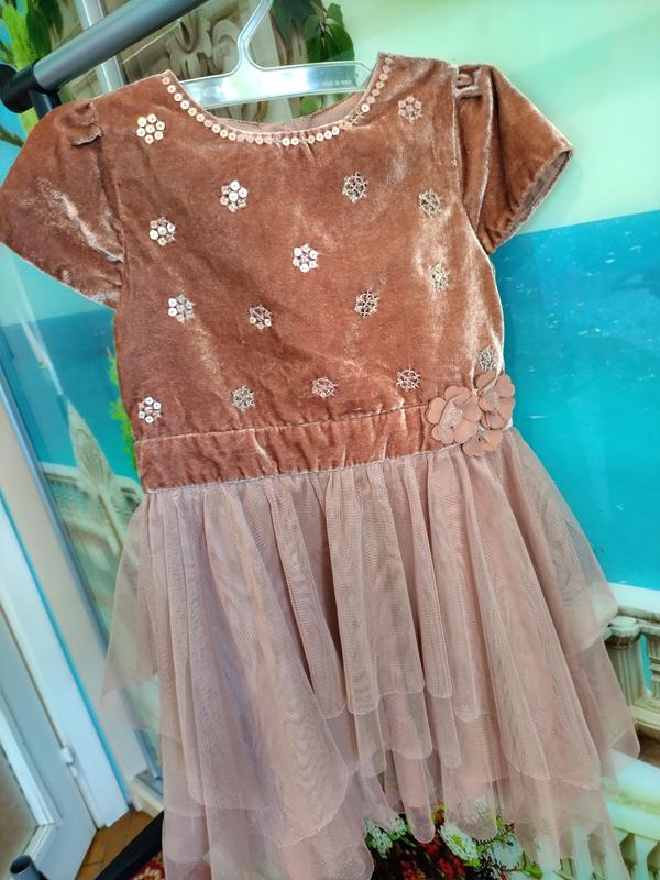 Нарядное платье, застегивается на пуговицы-стразы, корсет велюровый, украшен пайетками и цветками на поясе. Натуральная подкладка. В поясе-28 см, юбочка -в несколько ярусов сеточка, длина-33 см. Цвет-кофе с молоком.