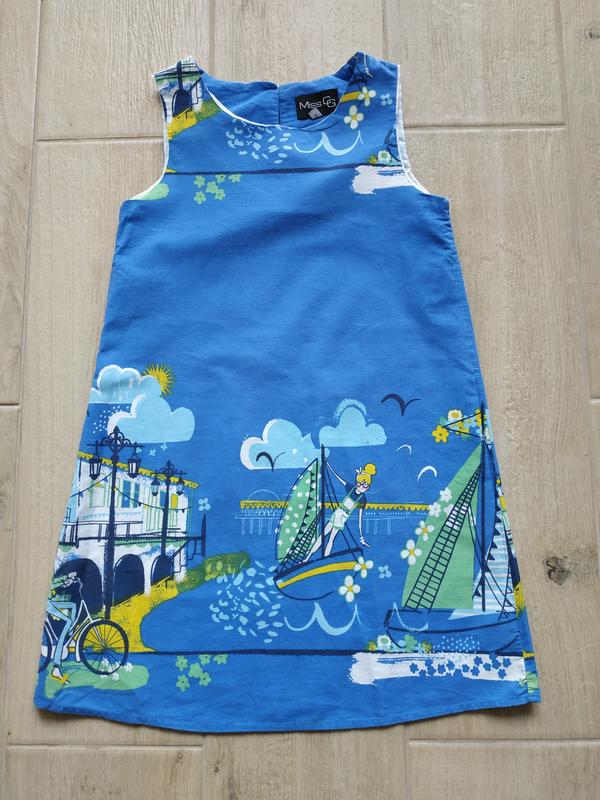 Літня, красива сукня. Для худенької дівчинки, не тягнеться. Довжина від плеча до низу-65 см. ПОГ-33 см. В районі ліфу підкладка з поліестеру. Вся сукня виконана з 100 відсоткового коттону.