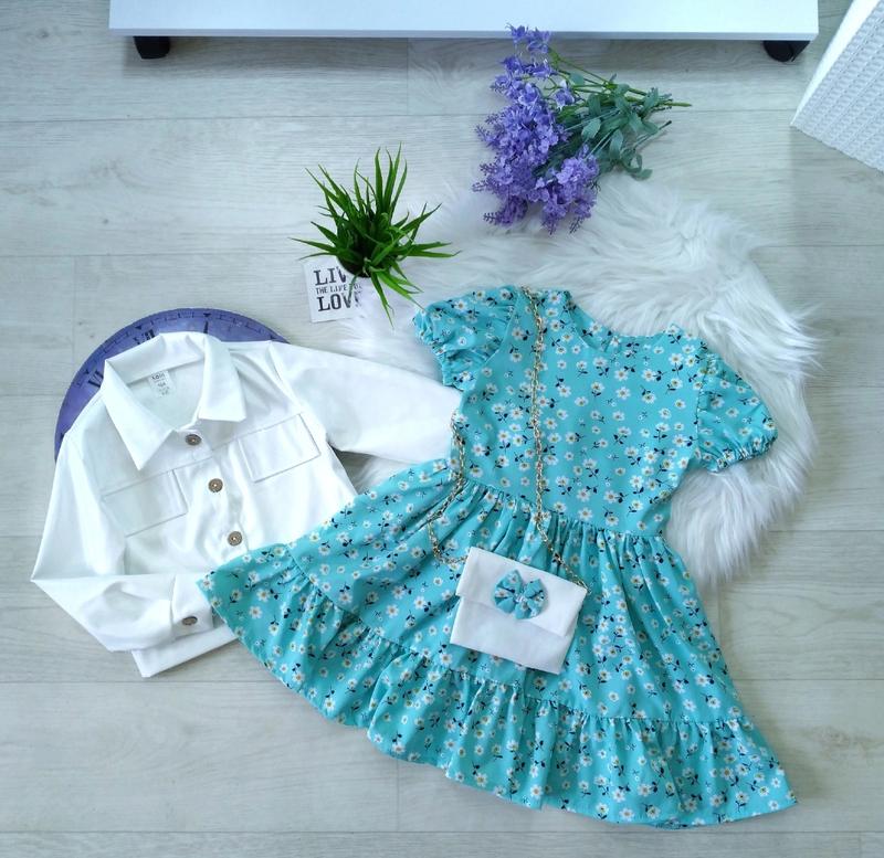 Неймовірно стильний комплект на дівчаток з сумочкою 💝💝💝 Легка та гарна сукня з короткими рукавами , пишна спідниця , 😃😃😃❣ Піджак з якісної єко - шкіри ,на рукавах та по всій довжині гудзики ,кишені оманки 💐💐💐💐💐 Тканина : софт ✨ єко-шкіра Виробник : Україна 🇺🇦 ЗАМІРИ +/-1-2см!!! ▪️р.104 довжина 58см/ ПОГ 28см. Курточка : довжина 33см/рукав від плечового шва 38см /ПОГ 33см.