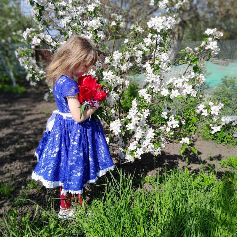 Платье шите по заказу из дорогого гипьюра низ молочный атлас Очень пышное и красивое подойдет на 5 -8 лет на фото 6 лет 122 рост. Пояс из атласной ленты есть отдельно бант