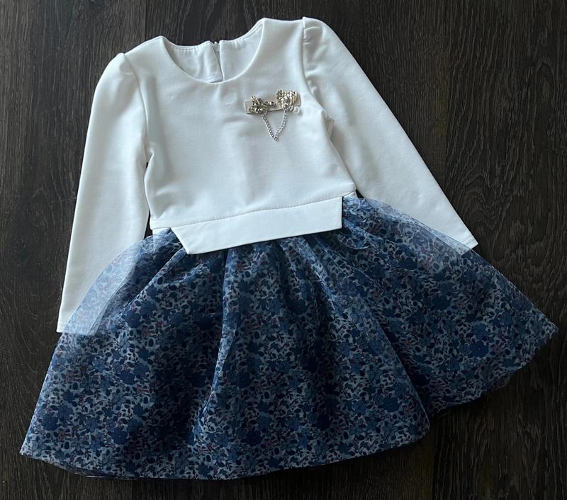 Сукня з неймовірно гарною спідницею Тканина: двухнитка,фатін+сітка Прикрашене гарною нашивкою На спинці блискавка Заміри!!! Рукав від плеча/довжина/ширина 98см. 34/57/26 104см. 36/59/27 110см. 39/61/28 116см. 43/64/29 122см. 44/67/30