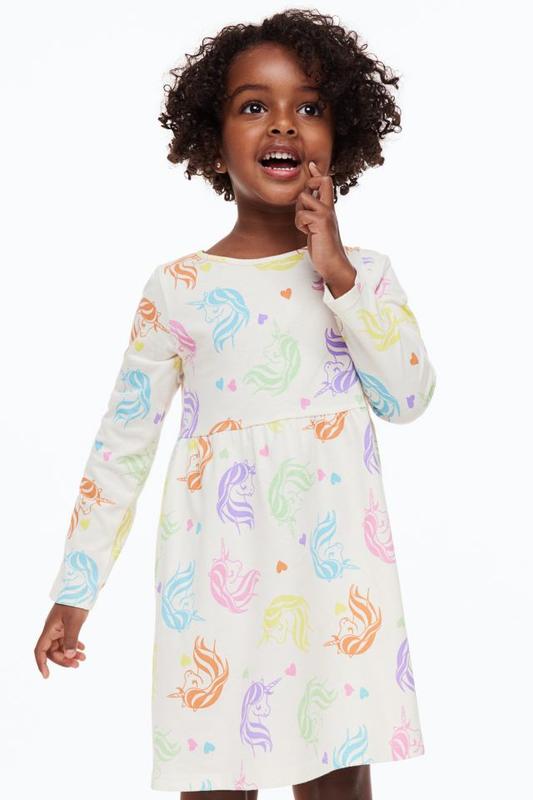 Сукня фірми Н&М. Сукня з довгими рукавами з м'якого бавовняного джерсі з малюнком, круглим вирізом, прилаштованим швом на талії та спідницею. Без підкладки. Машинне прання Склад 100% бавовна Розмір 4-6 років на зріст 110/116см ПОГ - 31см, довжина від плеча - 61см, ширина між плечима, -25см довжина рукава від плеча/від підмишки - 44см/34см Розмір 8-10 років на зріст 134/140см ПОГ - 36см, довжина від плеча - 77см, ширина між плечима, -29см довжина рукава від плеча/від підмишки - 53см/43см